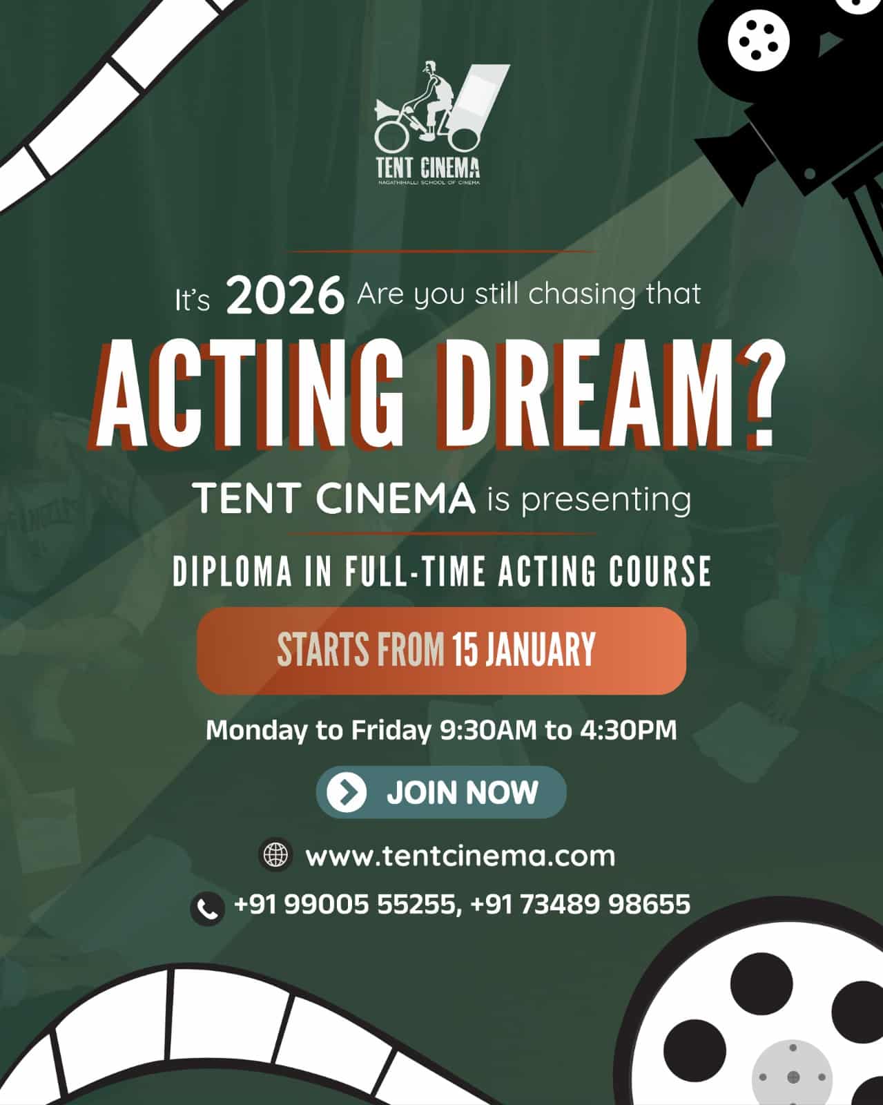 Founded in 2012, Tent Cinema is one of the best acting schools in Bangalore.It is another successful initiative from writer and filmmaker Dr. Nagathihalli Chandrashekhar’s continued efforts to introduce fresh artists and technicians into the industry.The school offers acting courses for adults and children as well as workshops in Scriptwriting, Filmmaking, Editing and Cinematography.